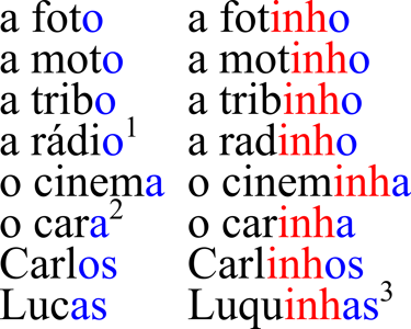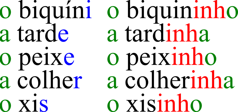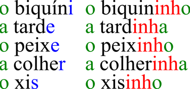 Quando uma palavra termina com outra letra diferente de -a,-o,-as,-os, o sufixo “inho/inha” passa a concordar com o gênero da palavra: às palavras masculinas, acrescenta-se “inho” e para as palavras femininas, acrescenta-se “inha”, do mesmo jeito que ocorre com o sufixo “zinho/zinha”, veja no exemplo a seguir: